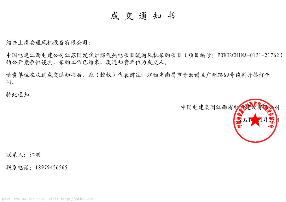 中電建江西電力中標通(tōng)知書